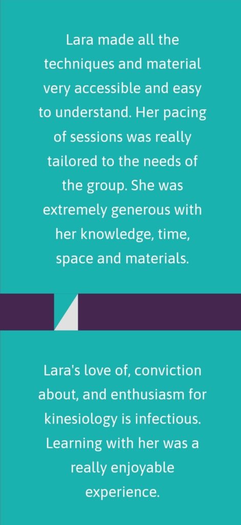 Lara has treated me on several occasions and is a great kinesiologist. I always feel better after her treatment and its amazing what she finds that is causing me issues.